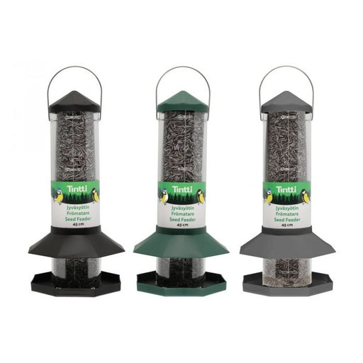 tinttiKorkeaan jyväsyöttimeen mahtuu runsaasti linnunsiemeniä ja läpinäkyvästä syöttimestä on helppo seurata täyttötarvetta.