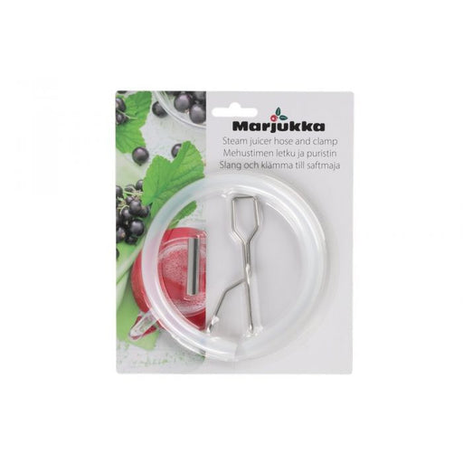MarjukkaElintarvikekelpoinen letku mehustimeen 220158 sekä letkunpuristin.